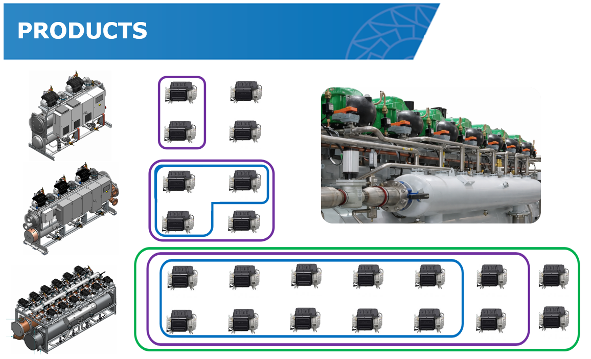 Onboard chillers are used on yachts, cruise ships, navy & multipurpose vessels, and ocean platforms. Typical capacity range is 85 to 2000 tons (300 kW to 7000 kW).